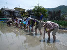 | 朝から不安定な天候。雨が降らないうち早速、活動スタートです。はじめに夏野菜生育状況の確認。トマトの誘引、また芽かきを行いました。その後、田植えを行いました。甲山農地の田植えは手で植えます。みんなでラインをそろえて行いますが、さすが大人といったところでしょうか。始まって早々にコツをつかみ、あっという間に20列植え終わりました。これから夏にかけては雑草、草抜き。秋にはスズメが食べにくるのを防がなくてはなりません。また、今後は小学生の田植え体験などが行われます。セミナー内ではありませんが子ども達に田植えや農体験について伝えていく活動もサポートいただければと思います。 | |||