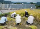 | 今回のセミナーはいよいよ稲刈りです。5月の田植え、7月8月の雑草抜き、ヒエ取り、畦の草刈りと成長をみてきました。稲刈り鎌の使い方の説明を受けた後、早速稲刈り、紐でくくり、稲木に干します。 畑の作業では、秋ナスの収穫が終わり、夏野菜の最後の撤収作業になりました。堆肥や石灰を混ぜて冬の葉ものの畝になります。2週間前に植えた冬野菜の生長を観察し、除草作業をしました。ダイコン、ニンジンは間引き作業を行った後、追肥を行いました。「冬野菜の栽培計画」の講義では、夏野菜からの切り替え時期や、畑の作付け計画などを学びました。 |